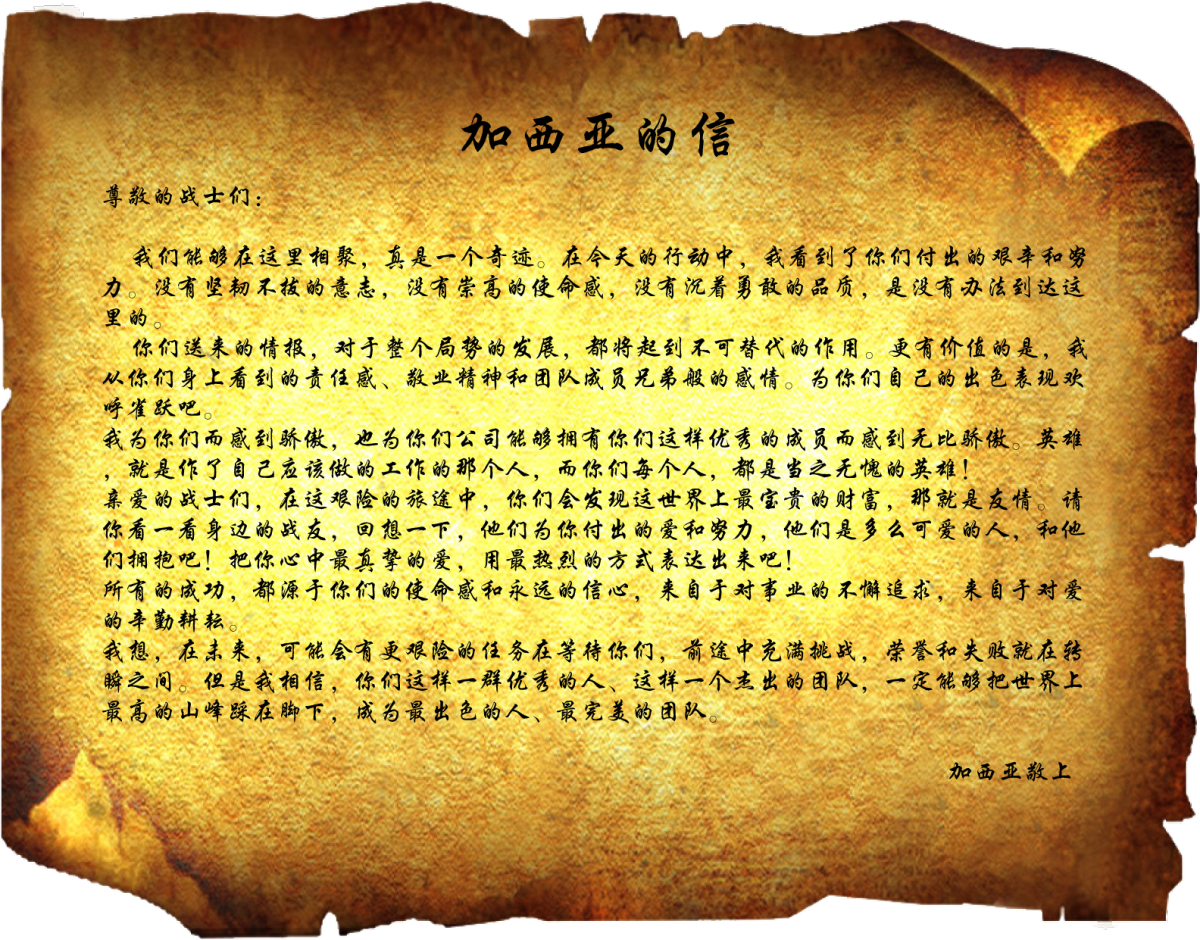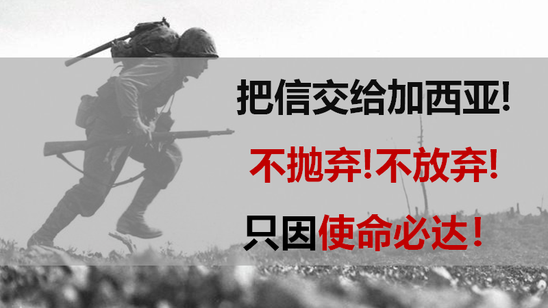 重新踏上征程,队员们完成这一系列的艰难险阻终于找到了加西亚将军,一路上有汗水有泪水,但是完成任务的喜悦冲淡一切疲惫,加西亚将军(一般由单位领导扮演)庄严的向每位队员行军礼,并一一握手,从队员手中接过要交给他的信;并大声将信的内容念出,学员们带着自豪,享受荣誉的盛宴。