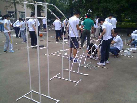 培训师发给每个小组材料,要求团队在没有图纸和参照物的情况下,搭建一座过山车。