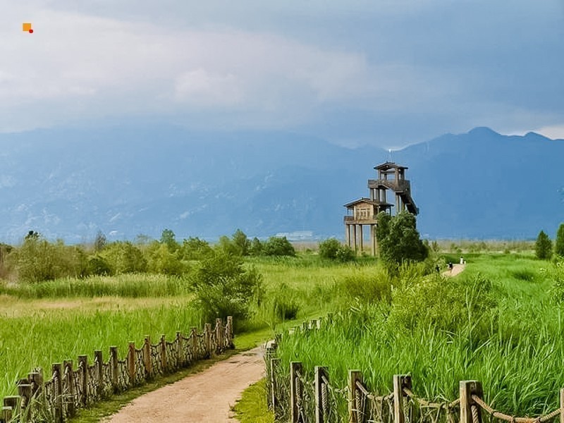 这里也是华北地区最大的湿地公园。水草芦苇丰茂,风吹过的时候,非常漂亮,公园沿途有亲水木站台,鸟岛,湿地观景台,望湖楼,西保护站,观鹤台,湿地百草原等特色景点。 最经典的拍照地就是望湖楼了,不需要航拍器,登上望湖楼,就可以拍出各种大片!这里也是鸟瞰湿地的最佳观景处。