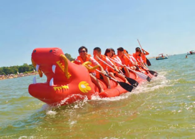 比赛过程中8名选手用力划桨,使龙舟前行,完成比赛用时最短的队伍获胜