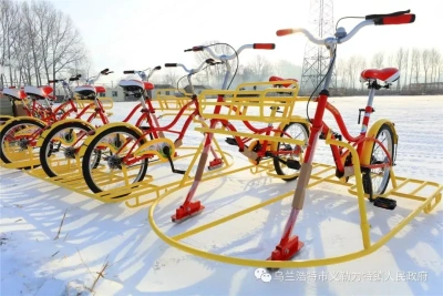 2、 每队4名队员,每人手持曲棍球杆,各自登上冰上自行车