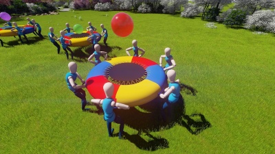 动感颠球又叫击鼓颠球或者击鼓飞扬,这是一个团队合作项目,要求全体组员都参与其中,全体组员集体合作拉住一个特质的有绳索的鼓进行颠球,比赛时间内以球不落地颠球次数最多的组获胜。这个项目能让队员体验团队协作快乐,培养团队协作的统一性和协调性。